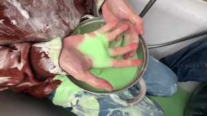 Anastasia doesn't hold back in this video, dog food, fish, lard it all goes in and all goes over her. First part is just her mixing the mess wearing an very sexy shiny red catsuit second part she gets covered in it.