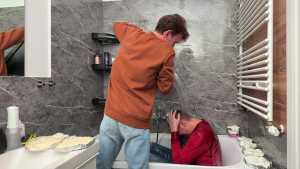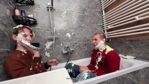This is the most awesome (well thought out and prepared) gunge session with two beautiful young men I've seen in a long time! Andrii and Artem understand it in their playful way only by whispering, gently challenging, making jokes with each other and of course splat sounds to lure every gunger into the scene. A seduction that finds its equivalent and the right place in cakes and other slippery-sweet foodstuff. In the face, hair, neck, chest and trousers. We all know what that feels like. I'm looking forward to Part Two! (And thanks to the camerawoman for the great pictures.)