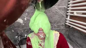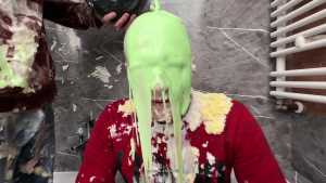 Anastasia doesn't hold back in this video, dog food, fish, lard it all goes in and all goes over her. First part is just her mixing the mess wearing an very sexy shiny red catsuit second part she gets covered in it.